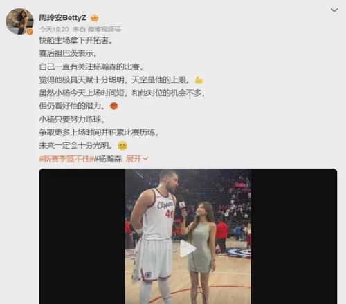 賽后,此役砸出21分8板3助2帽全面數(shù)據(jù)的快船首發(fā)核心中鋒祖巴茨,對(duì)與自己有著短暫對(duì)位的楊瀚森進(jìn)行了點(diǎn)評(píng),表示:“我一直在看他的一些比賽,非常有天賦,只需努力訓(xùn)練,但非常遺憾本場(chǎng)沒(méi)怎么看到其的發(fā)揮?!?/p>