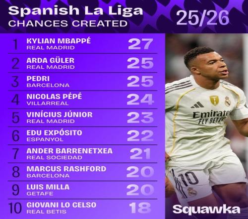 北京時(shí)間10月29日,知名數(shù)據(jù)平臺(tái)Squawka列出了本賽季西甲聯(lián)賽中創(chuàng)造機(jī)會(huì)最多的球員榜單,皇馬球星姆巴佩27次領(lǐng)跑榜單,居萊爾、佩德里25次緊隨其后。
